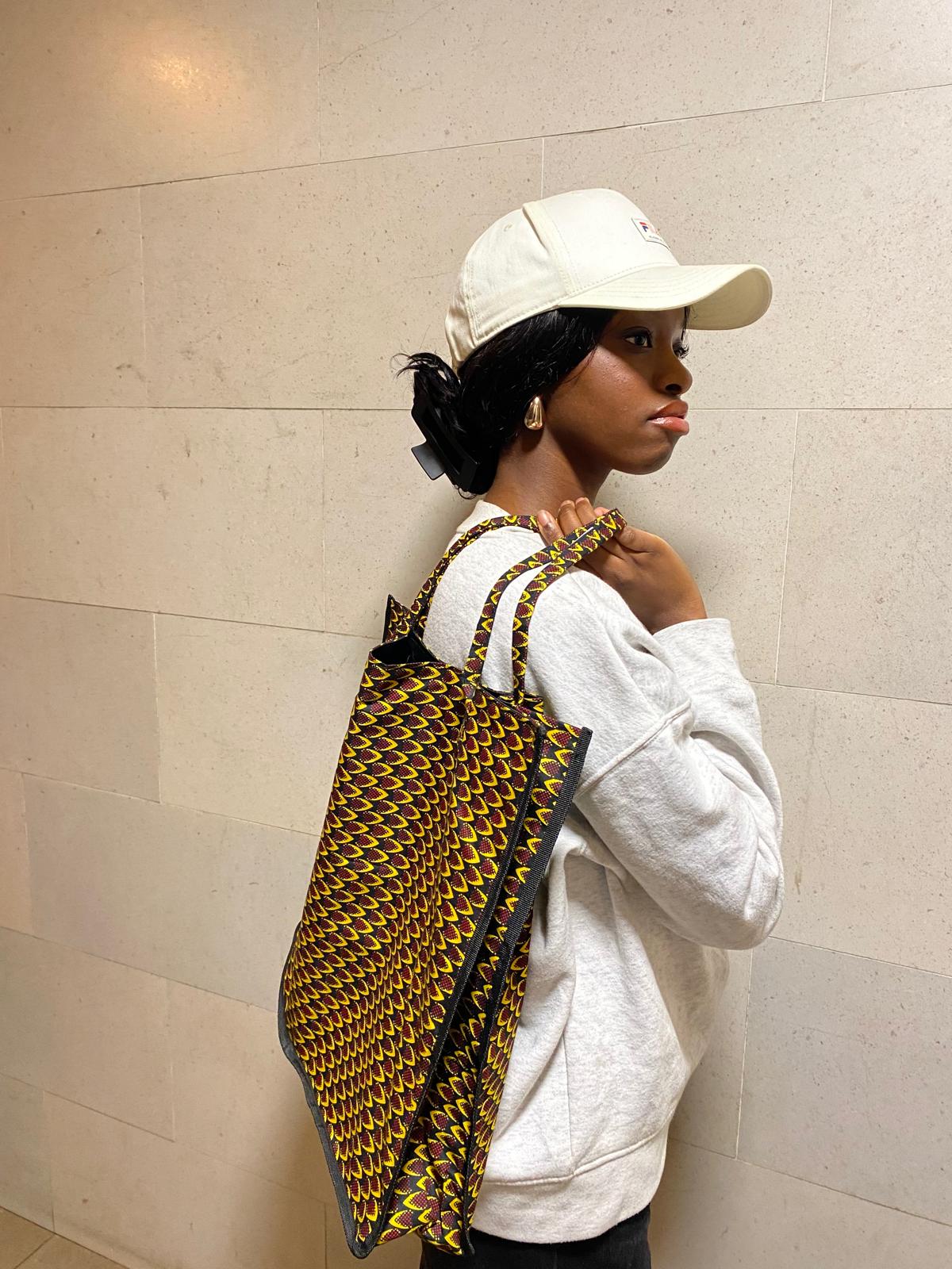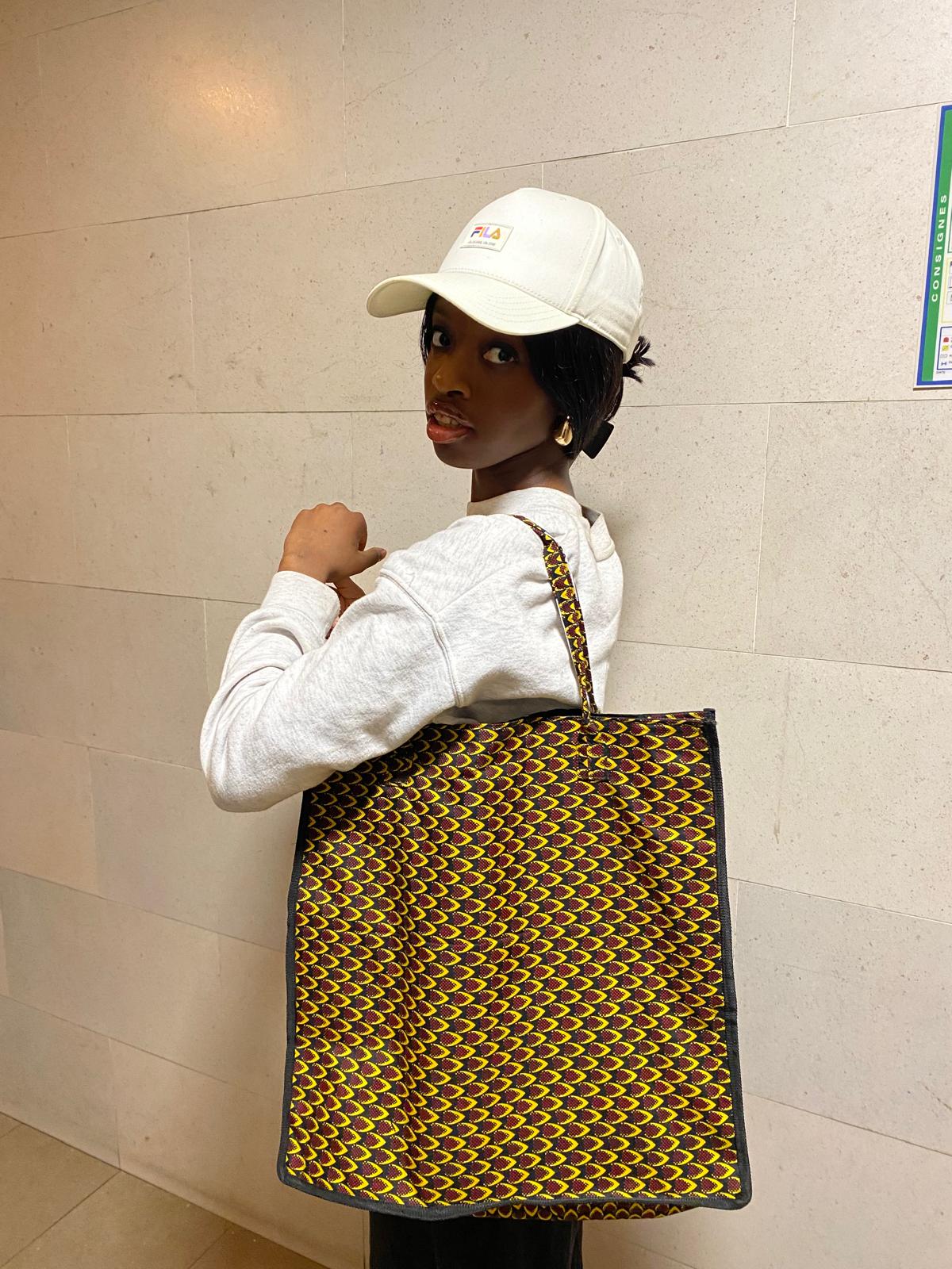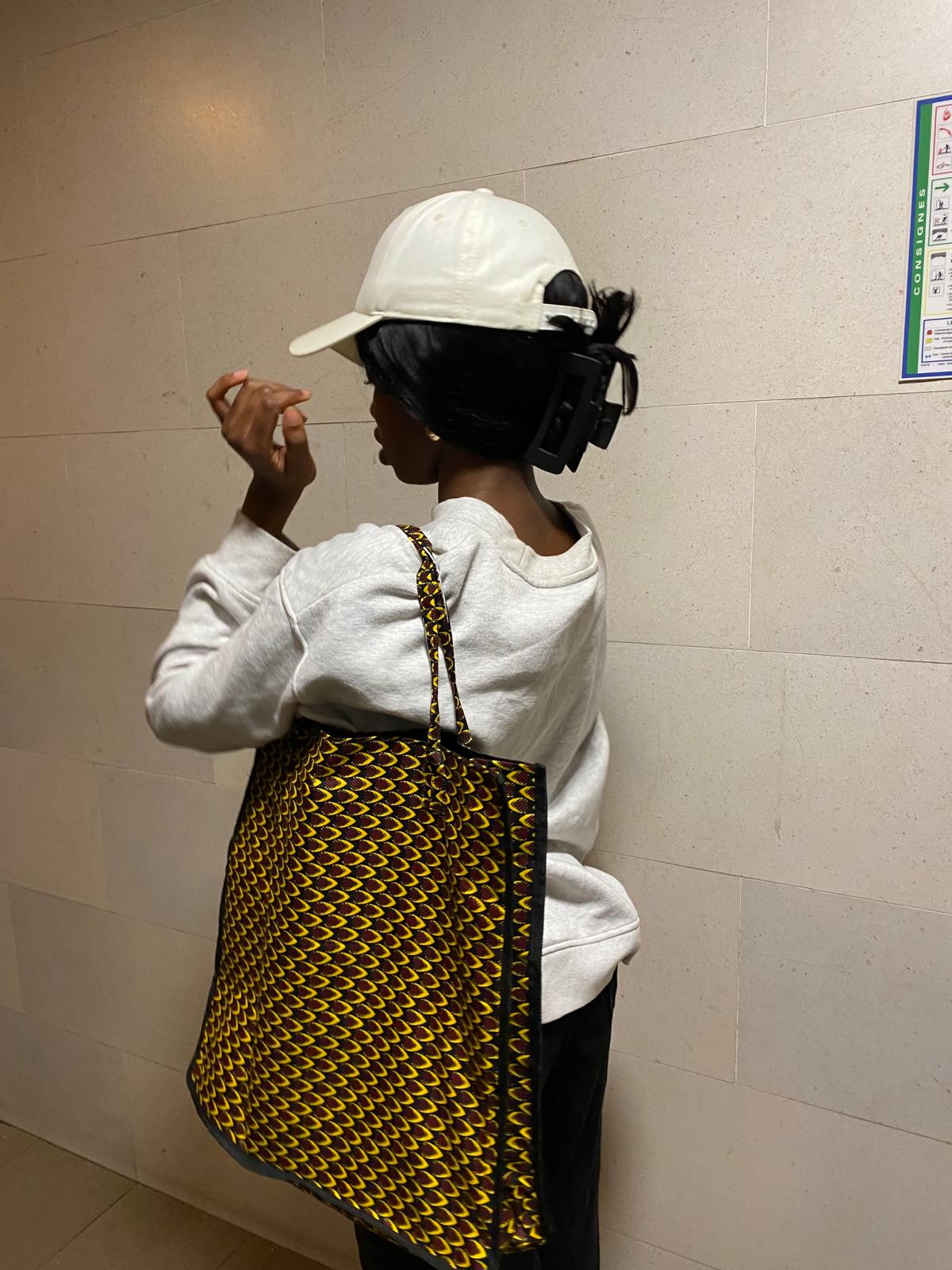 Nos Cabas Révolution, sont un modèle évoluer de nos Tote bag. Celui-ci est en tissu wax appelé écaille . Le modèle est doublé et composé d'une petite poche intérieure.