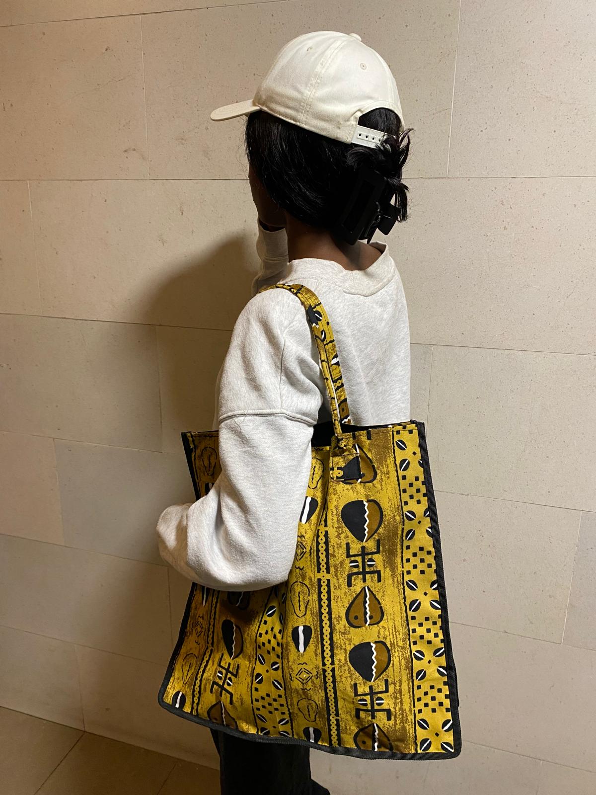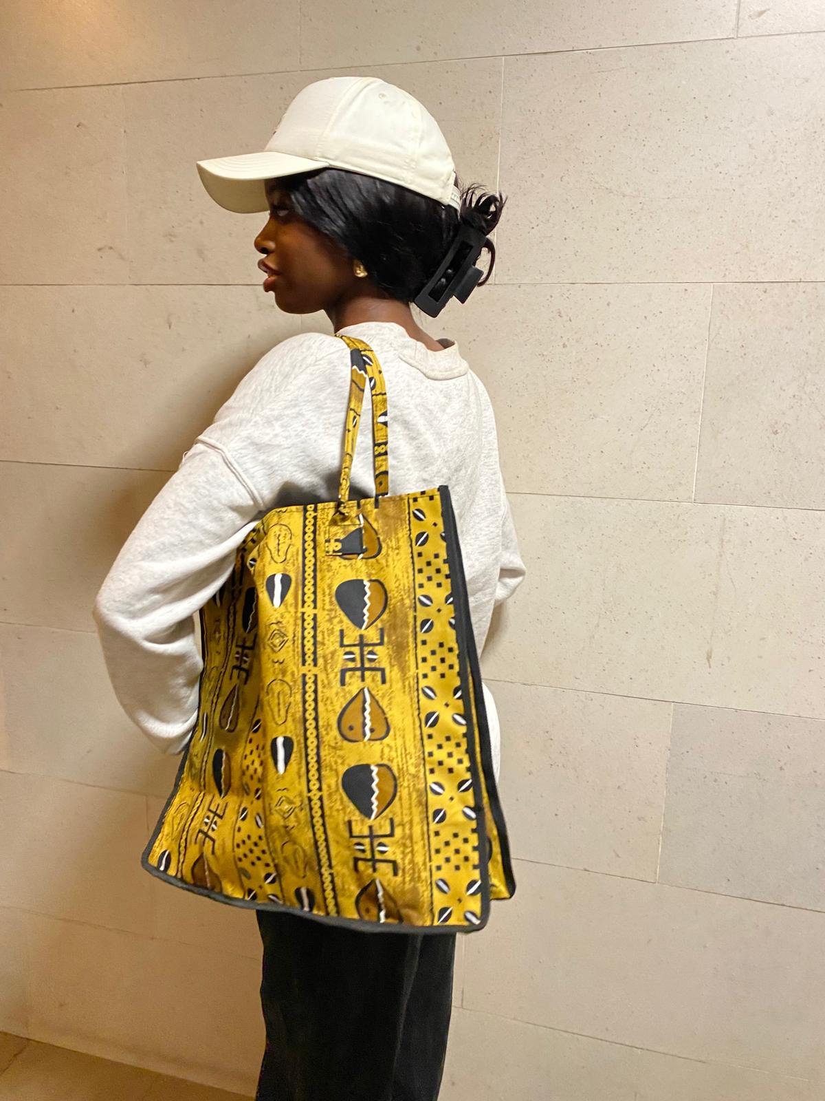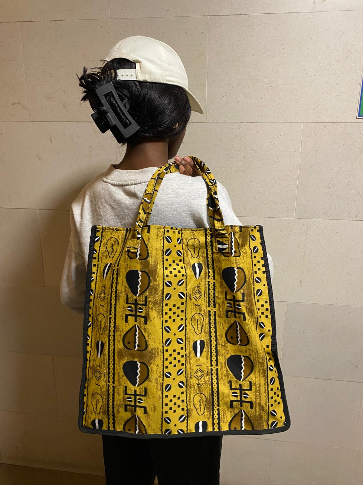 Nos Cabas Révolution, sont un modèle évoluer de nos Tote bag. Celui-ci est en tissu wax appelé Grain de café . Le modèle est doublé et composé d'une petite poche intérieure.
