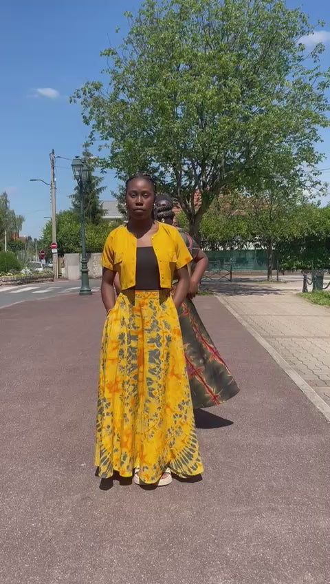 Nos ensembles koko tire leur nom du pagne traditionnel koko Donda avec lequel ils sont cousus. La chemise est accessorisée d’une petite poche et la jupe ajustée à la taille es composée de deux poches latérales