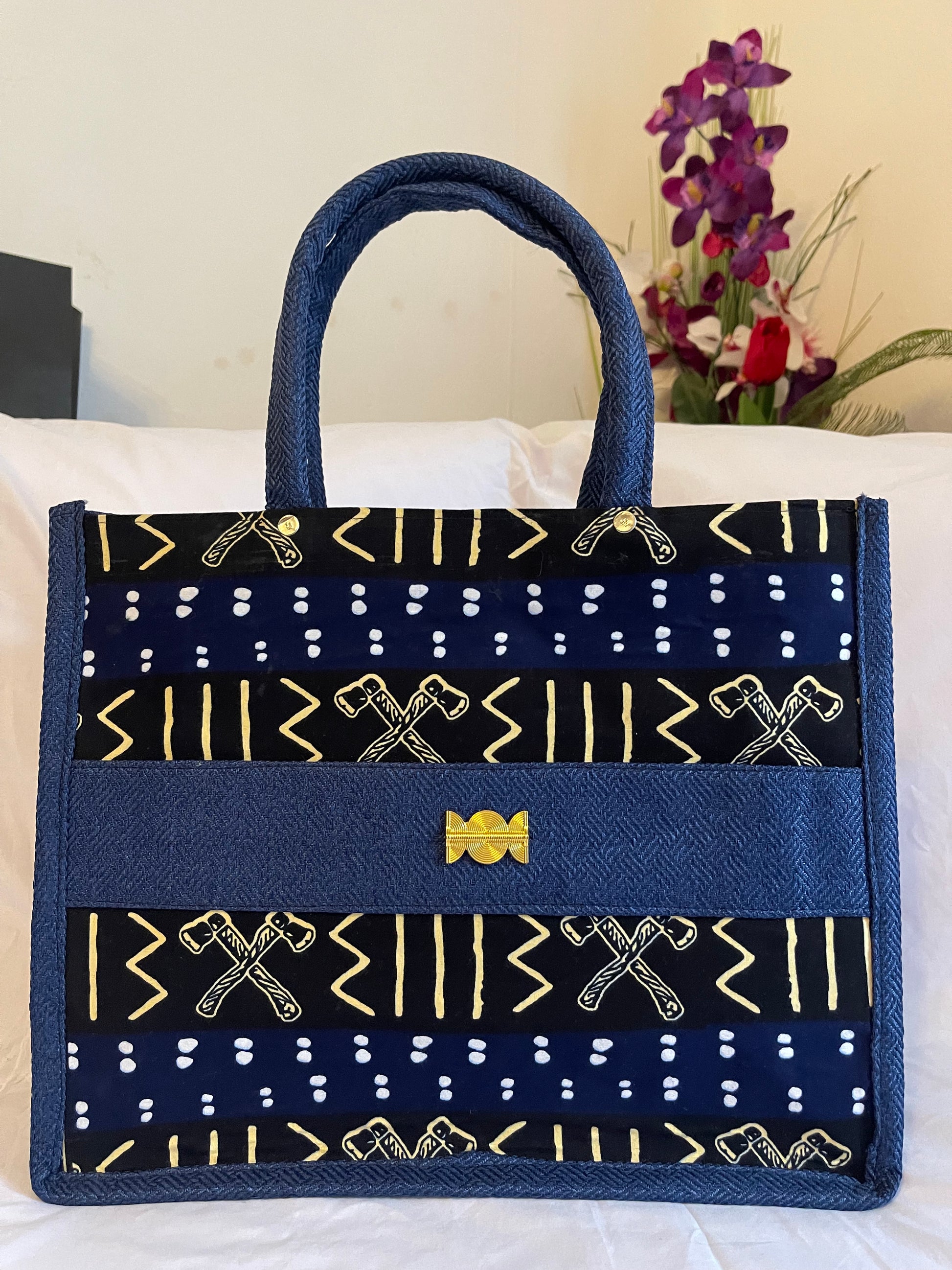 Cet élégant sac à main africain est une pièce unique faite à la main par des artisans ivoiriens. Réalisé avec des tissus wax de qualité supérieure , ce sac est décoré d'un poiré baoulé, symbole de royauté dans la tribu des Akan.