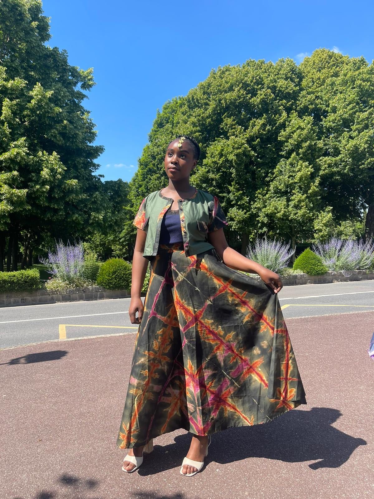 Nos ensemble Koko tire leur nom du pagne traditionnel Koko Donda avec lequel ils sont cousus. La chemise est accessorisée d’une petite poche et la jupe ajustée à la taille es composée de deux poches latérales