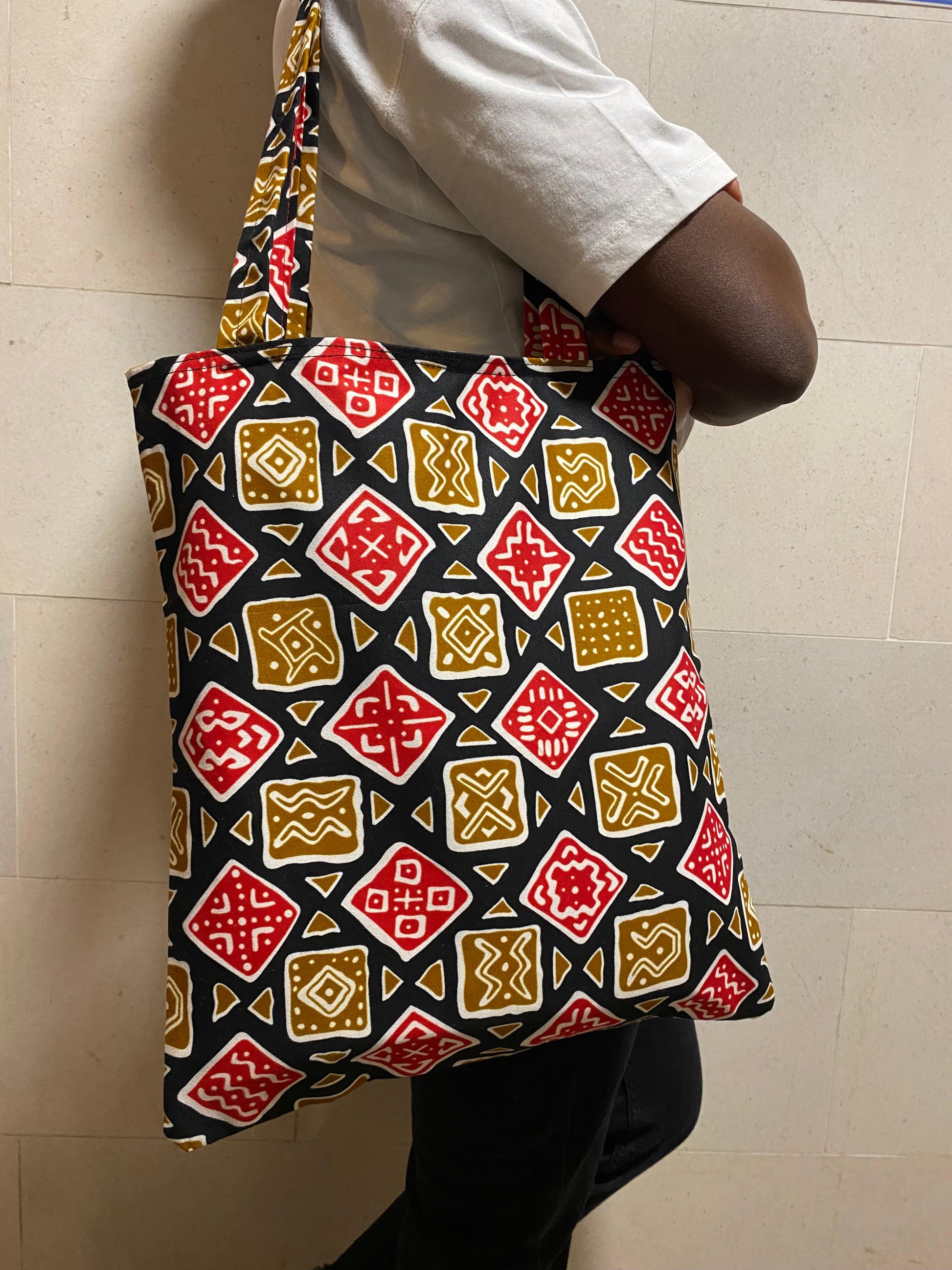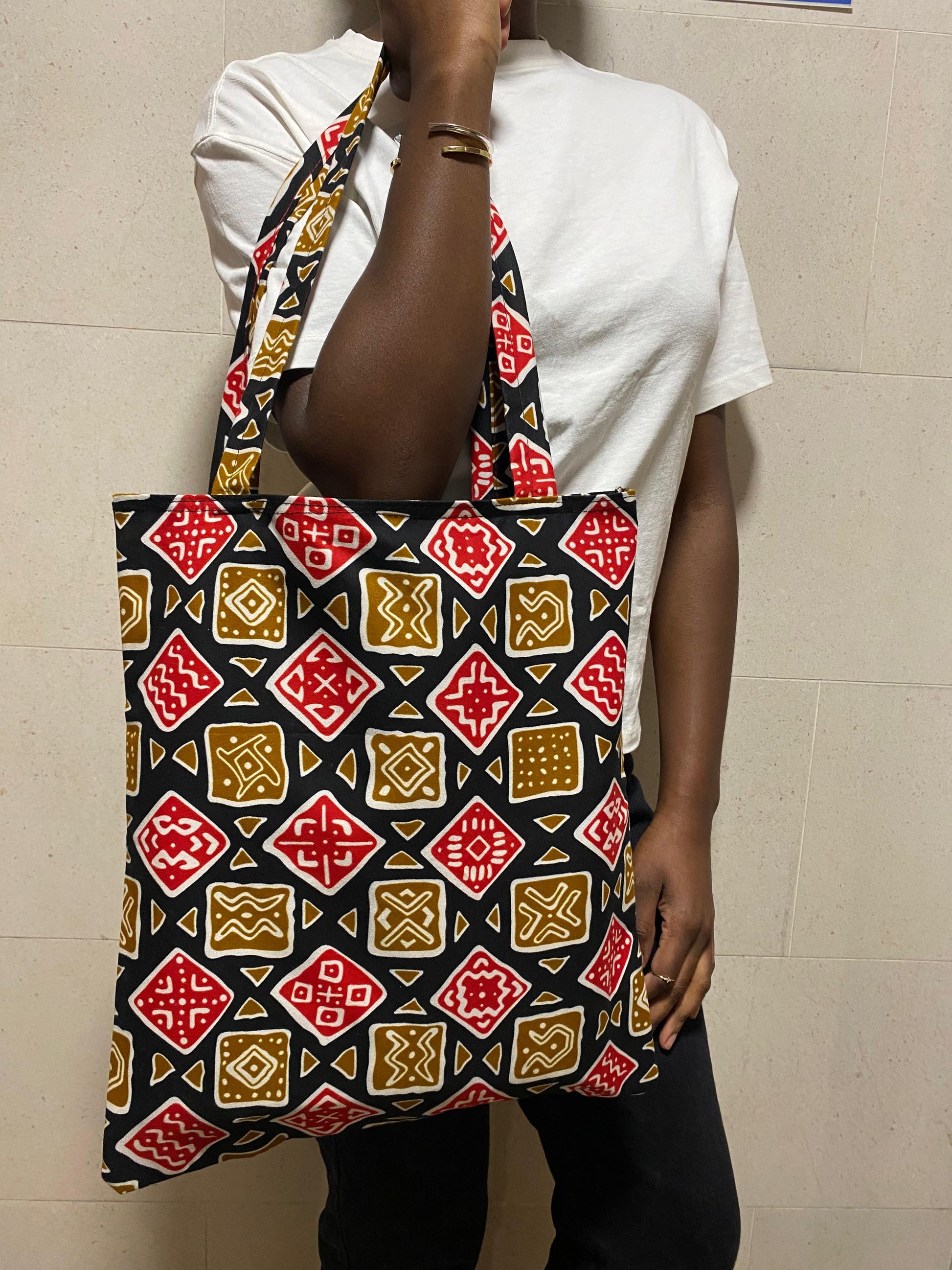 Tote bag en imprimé wax avec petite poche intérieur et doublure.